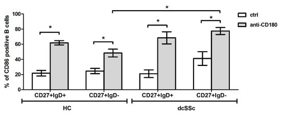 Activated memory B cells are reported in SSc by multiple research groups including ours [22,23,24,25]. According to our previous results memory B cells are activated via CD180 [26], thus we compared the CD86 expression of non-switched (CD27+IgD+) and switched (CD27+IgD−) memory B cell subsets in dcSSc and HC after anti-CD180 stimulation and found that the percentage of CD86+ switched memory B cells was significantly higher in dcSSc than in HC. Nevertheless, the frequency of CD86+ cells was increased in both memory B cell subsets both in dcSSc and HC (Figure 6).