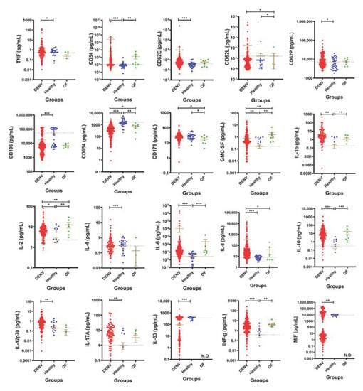 The levels of cytokines in DENV patients. Patients were divided into three groups: Laboratory confirmed DENV-2 patients (DENV), laboratory confirmed DENV negative (OF) and healthy volunteers (Healthy). Only cytokines having a significance difference between either DENV, Healthy or OF were shown here. Cytokines with no significance difference can be found in Supplementary Figure S1. Mean ± SEM. Horizontal dotted line represents health mean average. N.D (no data). p < 0.05 *; p < 0.01 **; p < 0.001 ***.