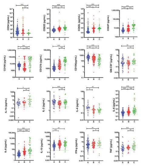 Since the involvement of cytokines is hypothesized to be involved in the progression of SD, we explored the profile change in the levels of cytokines in dengue patients at the different severity of the disease. It was clearly observed that almost all cytokines expression levels were increased when compared to the healthy control mean (baseline) Figure 2. Cytokine profile analysis revealed a significant difference in the levels of CD62E (p < 0.001), CD62P (p < 0.001), CD106 (p = 0.0333), CD121b (p < 0.001), IL-6 (p < 0.005) and IL-8 (p < 0.001). Not only did these cytokines reveal a significant difference between the different groups (A, B and C), but also showed an increased pattern expression along with the disease severity Figure 2. CD154 (p < 0.001) also showed a significant difference between the different groups (A, B and C), but exhibited a decreasing pattern along with the disease severity Figure 2. CD62L (p < 0.001) showed a significant difference between the different groups but did not show any pattern along with the disease severity. Even though IL-1b and IL-10 showed a visible increase pattern along with the disease severity there was no significant difference between the A and B groups, and the B and C groups, respectively. IL-4 and IFN-g also showed a decreasing pattern along with the disease severity but showed no differences in statistical analysis between B and C and A and B groups, respectively. Of note, there was no significant difference for cytokines CD14, CD176, IL-12p70, IL-17A, IL-33, MIF and ST2 between any of the groups Supplementary Figure S2.