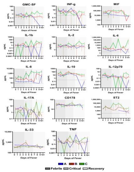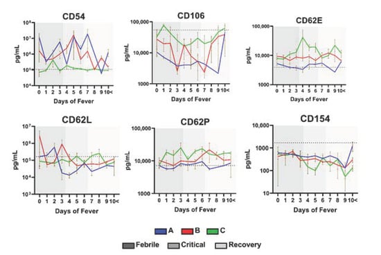To better observe the overall changes of individual cytokines, the expression profile of individual cytokines for different days of fever and disease severity were plotted—Supplementary Figure S3. It was observed that all the cytokines concentration fluctuated significantly in the different groups and over the days of fever as reflected by the mean and graphs—Table 1. Vascular damage and hemorrhage are the hallmark features of increased vascular permeability in dengue patients. Clinical evidence suggests that vascular damage plays a key role in the pathophysiology of dengue hemorrhagic fever (DHF). During disease progression, infected cells produce inflammatory cytokines such as TNF-α, IL-6, and IL-10. As a result of this stimulation, endothelial cells increase the expression of adhesion molecules such as CD62E (E-Selectin), CD106 (VCAM-1) and CD62P (P-Selectin) which leads to local inflammation, endothelial damage and plasma leakage [,,]. Hence, our results demonstrated that adhesion molecules like CD54, CD106, CD62E, CD62L, CD62P and CD154, based upon the days of fever, all exhibited this fluctuation in their expression starting from day 0 when compared to the healthy control mean (baseline) but become more normal (baseline) in the recovery phase after day 8 Figure 3. Of note, the levels of pro-inflammatory cytokines like GM-CSF, IL-2, IL-6, IL-8 remained at an all-time high especially during the critical phase of the disease, CD178 remained at an all-time low Figure 4. On the other hand, cytokines like MIF, IL-10, and IL-33 peaked during the critical phase of the disease but became more normalized at the recovery phase after day 8 Figure 4. IL-1b, IL-12p70, IL-17A, TNF and ST2 showed no visible trend and fluctuated between the days of fever Figure 4.