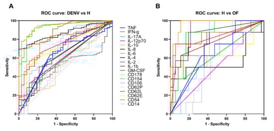 ROC curve of cytokines. Univariate logistic regression analysis was conducted. Performance of ROC curves of TNF, IFN-g, IL-17A, IL-12p70, IL-10, IL-8, IL-6, IL-2, IL-2, IL-1b, GM-CSF, CD178, CD154, CD106, CD62P, CD62L, CD62E, CD54 and CD14 for predicting DENV and differentiating from Healthy (H) and other fever (OF). Plots depict he tradeoff between sensitivity and specificity. The closer the curve follows the left-hand border and the top border of the ROC space, the more accurate the test. (A) ROC curve compared between DENV patients and healthy subjects. (B) ROC curve compared between healthy subject and other fever patients.
