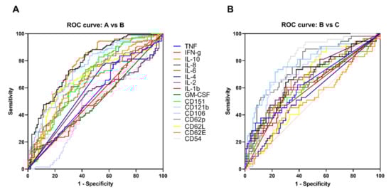 To further evaluate the diagnostic potential marker for distinguishing between the different disease severity, ROC curves were drawn. The ROC curve was plotted only for cytokines that showed significant differences in statistical analysis between the three groups. CD14, CD178, CD12p70, IL-17A, IL-33, MIF and ST2 were excluded from the ROC curve for not showing any significant differences in statistical analysis between the groups. It was observed that the area under ROC curve for CD121b did a better job in discriminating between the disease severity Figure 6A and Supplementary Table S1. A concentration of ≤1564.64 pg/mL was the optimal cutoff value (AUC = 0.744, Sensitivity = 71.87, Specificity = 66.99) for distinguishing between the A and B group, while a concentration of >4418.043 pg/mL was the optimal cutoff value (AUC = 0.775, Sensitivity = 71.70, Specificity = 77.67) for distinguishing between the B and C group Figure 6A,B, and Supplementary Table S1.