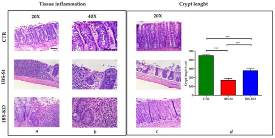 The histological analysis was performed upon the sacrifice after 10 weeks of treatment. Each case section of 3 μm-thick, deparaffined and stained with hematoxylin–eosin routine method and histochemical method for mucins (PAS) was analyzed. A score from 0 to 3 was assigned: 0 = absence of inflammation, 1 = mild inflammation, 2 = moderate inflammation, and 3 = severe inflammation. The sections were also considered for plasmacytosis and basal gap/ulceration, length of the crypt and mucin depletion. Figure 1 shows normal intestinal mucosa with intact epithelium in CTR, high inflammatory cell infiltration into mucosa and submucosa in IBS-St, and mild infiltration of mixed inflammatory cells in IBS-KD (Figure 1a,b). The evaluation of intestinal crypt length (Figure 1c) demonstrated no signs of crypt damage in CTR.