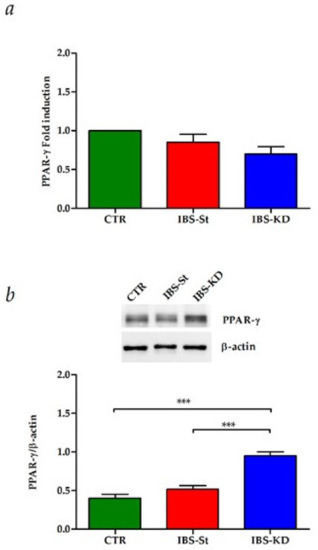 Moreover, in the same samples, no difference was present in the PPAR-γ gene expression among the three groups studied (Figure 3a), whereas KD was able to induce a significant overexpression of PPAR-γ protein, downstream factor tightly linked to function of CB receptors, compared to control and IBS-St (Figure 3b).