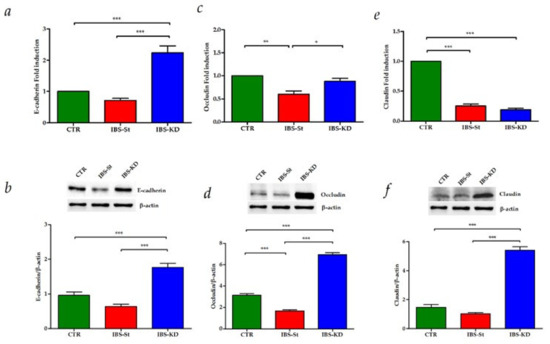 The analysis of tight junction (TJ) proteins’ expression showed that the mRNA and protein levels of E-cadherin and Occludin were induced by KD treatment in IBS rats compared to both control and IBS-St (Figure 5a–d respectively). For Claudin-1, no difference in mRNA levels was detected between IBS-St and IBS-KD group, probably due to a rapid mRNA turnover rate (Figure 5e). However, the treatment with KD caused a significant overexpression of Claudin-1 protein (Figure 5f) compared to the other groups.