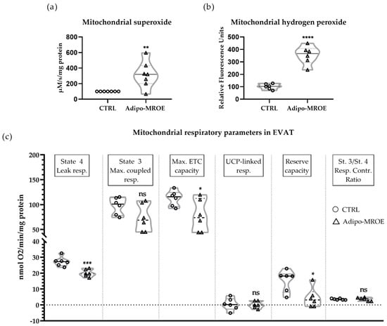MR-dependent AT OS is linked to mitochondrial OS and altered mitochondrial respiration in the EVAT of adipocyte-MR overexpressing mice. (a) EVAT mitochondrial superoxide-as measured by electron paramagnetic resonance (EPR)-and (b) the mitochondrial hydrogen peroxide concentration-as measured with Amplex Red assay-are increased in Adipo-MROE mice, showing mitochondrial OS; (c) measurement of mitochondrial respiration with the Oroboros O2k-Oxygraph shows decreased state 4 leak respiration and unchanged state 3 maximal coupled respiration in Adipo-MROE mice; leak respiration is not linked to uncoupling proteins (UCP) activation, as shown by the absence of UCP-dependent uncoupling (no effect of the UCP-specific inhibitor GDP) in both groups. Maximal electron transfer chain (ETC) capacity, reflecting ETC function, and reserve capacity-an indicator of energy furniture flexibility-are decreased in Adipo-MROE mice. Data are expressed as violin plots with quartiles and individual dots. n = 6 mice per group; * p < 0.05; ** p < 0.01; *** p < 0.001; **** p < 0.0001; ns = not significant, Adipo-MROE vs control. Contr.: control; ETC: electron transport chain; EVAT: epididymal visceral adipose tissue; GDP: guanosine diphosphate; MR: mineralocorticoid receptor; OS: oxidative stress; Resp.: respiration; UCP: uncoupling protein.