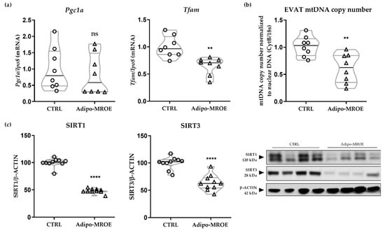 Mitochondrial biogenesis is regulated by activation of peroxisome proliferator-activated receptor gamma coactivator 1-alpha (PGC1-α), and of its downstream target, the mitochondrial transcription factor TFAM, enabling the synthesis of new molecules of mtDNA []. The gene expression of Tfam, but not of Pgc1-α is decreased in the EVAT of Adipo-MROE mice compared to controls (Figure 4a). Consequently, the number of copies of mtDNA per cell, which is a general marker of mitochondrial fitness, is reduced (Figure 4b). We also analysed the protein expression levels of the sirtuins SIRT1 and SIRT3, regulators of PGC1-α activity [], which were decreased in Adipo-MROE AT (Figure 4c). We assessed gene expression levels of subunits composing the electron transfer chain (ETC). We observed decreased expression of the NADH:Ubiquinone Oxidoreductase Subunit A9 (Ndufa9) and Cytochrome C Oxidase Subunit 5B (Cox5b), which are subunits that belong to complexes I and IV (Supplementary Figure S1).