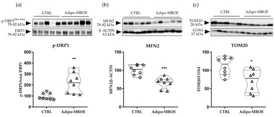 EVAT of Adipo-MROE and control mice were lysed for Western blotting as previously described []. Western blot samples were prepared with Laemmli Buffer (BioRad, Marnes-la-Coquette, France) and Criterion TGX Precast Gels (BioRad) were loaded with 30 µg of protein per well. Transfer was done on nitrocellulose membranes using the Trans-Blot® Turbo™ Transfer System (BioRad). Membranes were incubated overnight with primary antibodies (1:1000 in Bovine Serum Albumin 3%, 4 °C), followed by 2 h with horseradish peroxidase-conjugated secondary antibodies (1:4000 in 5% skimmed milk, room temperature). Antibodies used are listed in Table S3. Signals were detected by chemiluminescence (AmershamTM ECLTM, GE Healthcare, Buc, France), followed by signal acquisition with the ImageQuantTM LAS 4000 (Fujifilm, Tokyo, Japan). Blots were analysed densitometrically with ImageJ (ImageJ 1.43u). Quantification of phosphorylated proteins was normalised over total protein amount. β-actin was used as a housekeeping protein (1:4000 in Bovine Serum Albumin 3%, 4 °C), or the mitochondrial protein COX4 for TOM20 quantification to prevent variations due to mitochondrial mass. All reagents, otherwise indicated, were purchased from Sigma-Aldrich, Saint-Quentin-Fallavier, France.