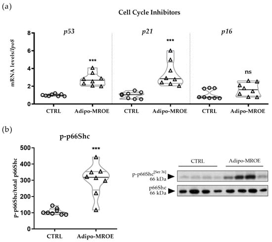 Cellular senescence and OS induced apoptotic pathways are induced in the EVAT of adipocyte-MR overexpressing mice. (a) p53 and p21 mRNA levels as assessed by qRT-PCR are increased in the EVAT of Adipo-MROE mice, while p16 mRNA levels are unchanged; (b) The phosphorylation of the P21 target p66SHC is increased in the EVAT of Adipo-MROE mice, indicating cellular response to OS. Data are expressed as violin plots with quartiles and individual dots. n = 8 mice per group; *** p < 0.001; ns = not significant, Adipo-MROE vs. control. Ipo8: importin 8.