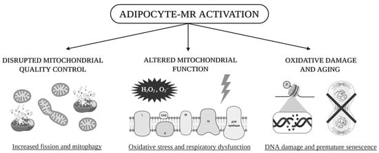 Obesity and comorbidities increase levels of reactive oxygen species (ROS) and decrease the antioxidant capacity in AT, leading to oxidative stress (OS) [,]. Mitochondria are a major source of ROS in AT and their dysfunction contributes to the pathogenesis of obesity []. Our group recently showed the implication of MR activation in AT mitochondrial OS in obese db/db mice []. Furthermore, the implication of aldosterone-induced OS and subsequent DNA damage has been established in the liver [,].