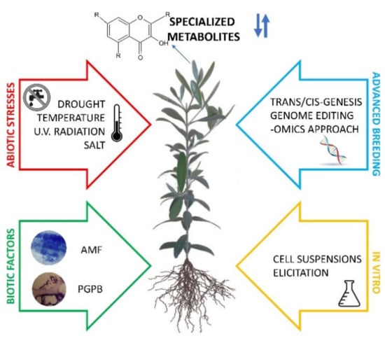 Scheme representing the diverse factors (natural, on the left, and artificial, on the right part) that can modulate specialized metabolites in plants: abiotic stresses as drought, salt, UV radiation and temperature; microorganisms (i.e., biotic factors) such as plant growth-promoting bacteria—PGPB and arbuscular mycorrhizal fungi—AMF; in vitro systems; advanced breeding techniques based on trans/cis-genesis, genome editing and -omics approaches.
