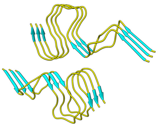 Disease-relevant polymorph of Aβ42 fibril (PDB: 2NAO) used for molecular docking and molecular dynamic (MD) simulations. β-structured regions are shown in cyan and non-β-structured regions are shown in yellow.