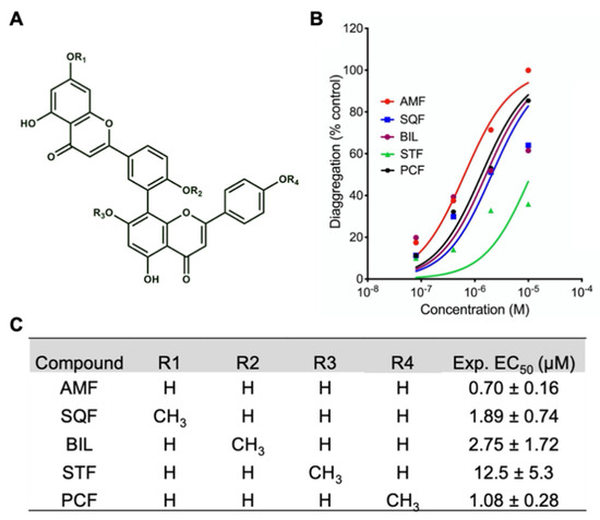 Thioflavin (ThT) assay disaggregation results from five biflavonoids. (A) Generic biflavonoid structure. R-groups for the different biflavonoids investigated in this study can be found in (C). AMF: amentoflavone; SQF: sequoiaflavone; BIL: bilobetin; STF: sotetsuflavone; PCF: podocarpusflavone. (B) Disaggregating activity of biflavonoids on pre-formed Aβ42 fibrils. Aβ42 fibrils (20 μM) were incubated with ThT (5 μM) in the presence of various concentrations of test compounds. Percent changes in fluorescent intensity of ThT vs. concentrations of the compounds were plotted. (C) The half-maximal effective concentration (EC50) values of the test compounds on disaggregation of Aβ fibrils were calculated and presented as mean ± S.E.M.