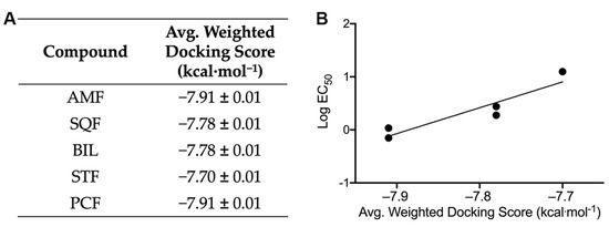 Molecular docking was carried out using the AutoDock Vina scoring function via the PyRx interface. An exhaustive docking method was used to generate sufficient sampling to be compared to EC50 values. The docking results for the most negative binding cluster for each biflavonoid can be found in Figure 3A. Furthermore, there is a significant positive correlation between the experimental EC50 values from the ThT fluorescence assays and the docking scores for the biflavonoids (Figure 3B).
