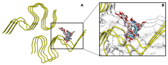 Depiction of the top docking poses from PyRx. (A) Aβ42 fibril structure (PDB: 2NAO) used for molecular docking and molecular dynamics (MD). (B) The most negative binding conformation from the docking calculations for the five biflavonoids overlaid in the N-terminal pocket of the Aβ42 fibril.