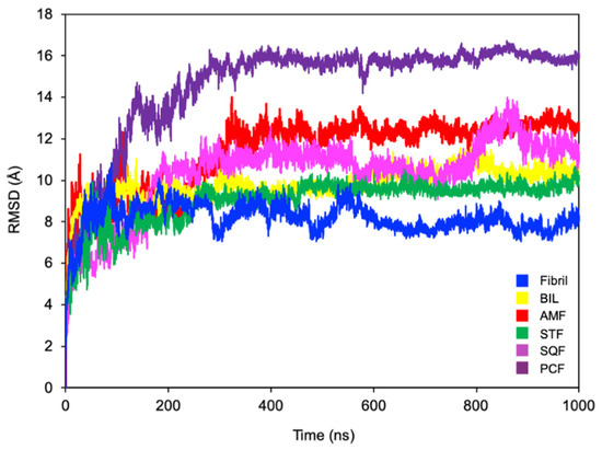 Comparative all atom RMSD for ligand-free and ligand-bound simulations using the equilibrated structure for each simulation as the reference structure. Simulations were performed with Aβ42 alone (Fibril) or in the presence of bilobetin (BIL), amentoflavone (AMF), sotetsuflavone (STF), sequoiaflavone (SQF), and podocarpusflavone (PCF).