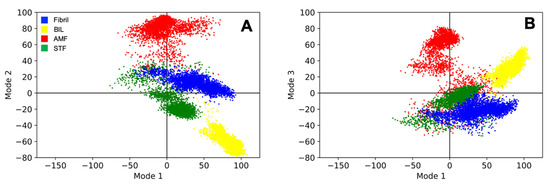 Principal component analysis (PCA) results from the ligand-free simulation and three representative ligand-bound simulations. Projection of the individual trajectories onto the first and second dominant modes of motion and (A) first and third dominant modes of motion (B) for three ligand-bound simulations and the ligand-free simulation showing the difference in motion between systems. Simulations were performed with Aβ42 alone (Fibril) or in the presence of bilobetin (BIL), amentoflavone (AMF), and sotetsuflavone (STF). Projections for the second and third dominant modes of motion can be found in the Supporting Information along with the data for all six simulations.
