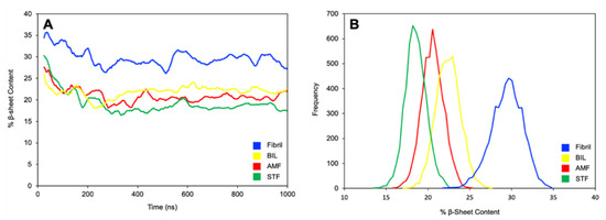 All simulations started with the fibril at 35% β-sheet content and decreased steadily over the first 500 ns. The decrease in β-sheet content stabilized during the last 500 ns for each simulation. The change in β-sheet content over time for the ligand-bound simulations and ligand-free simulation can be seen in Figure 8A. The ligand-free simulation showed a slight decrease in content relative to the starting structure, stabilizing at 29% following equilibration and relaxation. The ligand-bound simulations showed a larger decrease in β-sheet content relative to the ligand-free simulation, stabilizing around 20%. This larger decrease in β-sheet content suggests that the presence of biflavonoids promotes new structural conformations of the Aβ42 fibril.