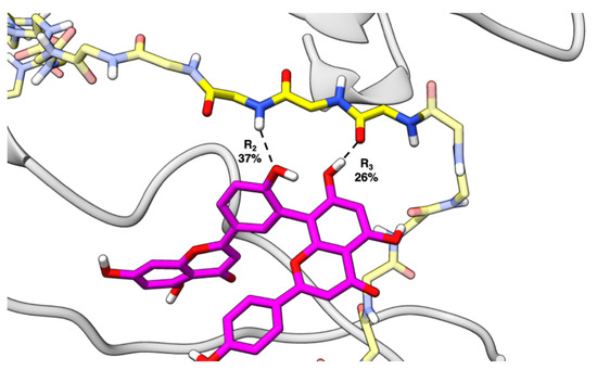 Amentoflavone (AMF) forming hydrogen bonds between R2 and R3 and the peptide backbone with hydrogen bond formation percentages by respective R-group (amino acid R-groups are stripped for clarity).