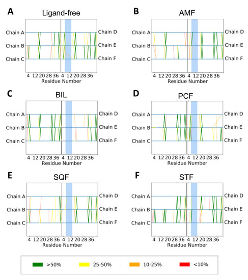 Protein backbone hydrogen bonding analysis derived from simulations of Aβ42 with (A) no ligand, (B) amentoflavone (AMF), (C) bilobetin (BIL), (D) podocarpusflavone (PCF), (E) sequoiaflavone (SQF), and (F) sotetsuflavone (STF). Hydrogen bonds percentages were calculated over the each 1.0 μs simulation, and were categorized by the percent of frames with backbone hydrogen bonds present: >50% (green), 25–50% (yellow), 10–25% (orange) and less than 10% (red). Each line depicted shows a backbone hydrogen bond present during the simulation to and from one of the six peptides (Chains A–F) from the original structure (PDB 2NAO). The blue highlighted region depicts the area with the most direct contact with each ligand from docking. Larger images of each panel with amino acids 1–42 listed explicitly can be found in the SI.