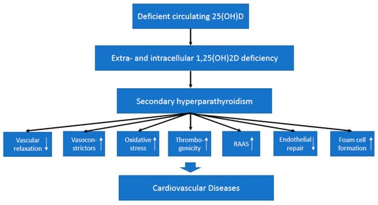 Suggested effect of vitamin D deficiency on the risk of cardiovascular disease. Notes: 25(OH)D, 25-hydroxyvitamin D; 1,25(OH)2D, 1,25-dihydroxyvitamin D; RAAS, renin–angiotensin–aldosterone system. White arrows indicate suppression or activation, where appropriate.