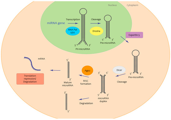 microRNA genes located in intragenic and intergenic regions are transcribed by RNA polymerase II and III, resulting in a hairpin-like molecule which is thereafter processed first by a RNase III enzyme known as Drosha which shortens it to approximately 70 nucleotides, representing the precursor-microRNA (pre-microRNA) [19,20,21,22]. This precursor is further transported by Exportin-5 to the cytoplasmatic space where it is once again cleaved by an RNase III enzyme known as the Ago2/Dicer complex, giving rise to small, mature double strands of microRNA [23]. Afterward, the passenger strand will be most often degraded, while the guide strand will form the RNA-induced silencing complex (miRISC) through which microRNAs exert their gene regulatory functions by binding to their targeted mRNA [24] (Figure 1). According to previous literature, one microRNA can target multiple mRNAs and, in turn, one mRNA could possess binding sites for numerous microRNAs [25].