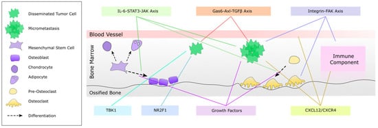 Cell–cell communication pathways as possible targets to prevent development of or treat bone metastasis. Bone metastasis is mediated by many tumor intrinsic factors, but also by cell–cell communication between tumor cells and bone resident cells. Precursor cells residing in the bone marrow can differentiate into immune cells or bone remodeling cell types such as osteoclasts and osteoblasts, which can either inhibit or promote tumor cell growth and progression into a micrometastasis. Cellular processes such as immunosuppression, bone remodeling or angiogenesis can also promote development of macrometastases in the bone, and often share regulatory pathways which could serve as very effective therapeutic targets.