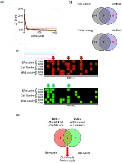 Next, we employed these 21 drugs in the in-cell assays described in [,,] using one cell line modeling primary tumors (i.e., MCF-7 cells) and one cell line modeling MBC expressing the Y537S mutated transcriptionally hyperactive ERα (i.e., Y537S). In particular, we treated each cell line with each drug at a final treatment concentration of 2 μM for 3 and 7 days and measured both the ERα levels and cell proliferation as described in [] as well as the wild type (wt) and Y537S mutant ERα transcriptional activity at 1 or 3 days after drug administration as described in [,] and searched for those molecules blocking the different aspects of ERα signaling. Figure 1c shows in red or green squares the positive hits in each assay for each cell line. As indicated by the red or by the green arrows (Figure 1c), we selected in each cell line only those compounds that were identified in at least 4 out of 6 datasets. Comparison of the 6 drugs identified in both cell lines revealed that clotrimazole (Clo) and fenticonazole (Fenti) were able to affect ERα signaling in both MCF-7 and Y537S cells while econazole and tigecycline were able to interfere with receptor functions in MCF-7 or Y537S cells, respectively.