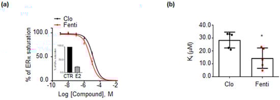 The ability of Clo and Fenti to bind ERα was analyzed through an in vitro fluorescence-polarization-based competitive binding assay in a wide range of drug concentrations using E2 as a positive control. Figure 2a (and relative inset) shows that both Clo and Fenti displace the fluorescent ligand, which mimics E2, from ERα. As expected E2 almost completely displaces the fluorescent ligand (inset in Figure 2a). Calculation of the IC50 (i.e., Ki) revealed that both compounds bind in vitro to the ERα in the micromolar range (i.e., ~28 µM for Clo and ~14 µM for Fenti) with Fenti having an increased affinity towards the receptor (Figure 2b).