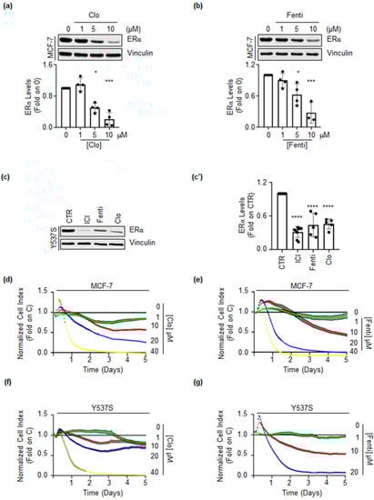 Next, we tested if these two drugs could affect the receptor intracellular levels. As shown in Figure 3a,b, treatment of MCF-7 cells for 72 h with different doses of both Clo and Fenti induced a dose-dependent reduction in ERα intracellular levels. Moreover, Clo and Fenti administration reduced the ERα content in Y537S cells to levels comparable to those determined by the administration of the SERD ICI (Figure 3c,c’).