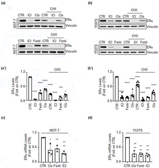 Results show that ICI, Clo, Fenti, and CHX reduce ERα levels, as expected. Interestingly, in either cell line both ICI, Clo, and Fenti were able to further influence the CHX-dependent reduction in ERα intracellular levels (Figure 4a,a’,b,b’).