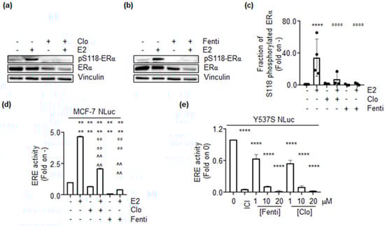 Because Clo and Fenti reduce ERα intracellular content in MCF-7 and Y537S cells, we next evaluated if these two drugs could also affect receptor transcriptional activity. The ability of the ERα to control gene expression depends on its E2-induced activation. E2 administration triggers receptor phosphorylation on the S residue 118, which is a pre-requisite for full ERα transcriptional activity []. Thus, we text evaluated the impact of Clo and Fenti on the activation state of the ERα. To this purpose, we measured the E2-induced S118 phosphorylation status of the receptor in the presence or in the absence of E2 administration to MCF-7 cells. As expected [], 30 min E2 administration increases the ERα S118 phosphorylation in MCF-7 cells (Figure 5a,b). Notably, pre-treatment of MCF-7 cells with Clo and Fenti completely prevented the ability of E2 to induce ERα S118 phosphorylation (Figure 5a–c).