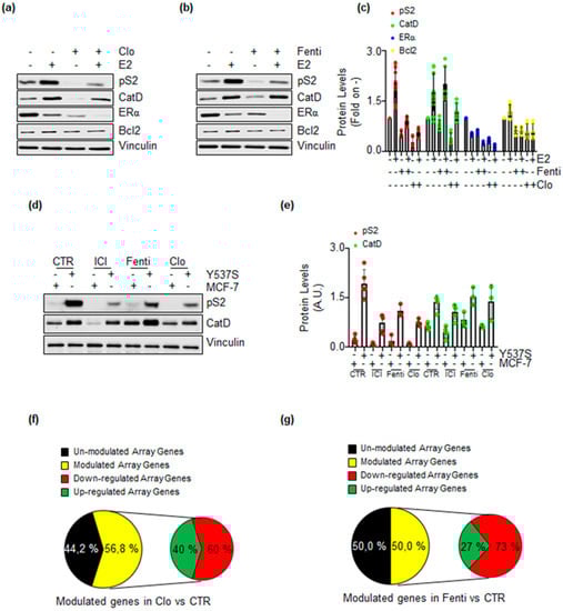 The impact of clotrimazole and fenticonazole on ERα-dependent gene expression. Western blotting analysis of ERα, presenilin 2 (pS2), cathepsin D (Cat D), and Bcl-2 expression in MCF-7 cells pre-treated with clotrimazole (Clo 10 µM) (a) and fenticonazole (Fenti 10 µM) (b) for 72 h. (c) Densitometric analysis relative to panel (a,b). The loading control was done by evaluating vinculin expression in the same filter. Panels show representative blots of three independent experiments. Western blotting (d) and relative densitometric analyses (e) of pS2 and Cat D protein levels in Y537S cells compared to MCF-7 cells. Cells were treated with clotrimazole (Clo 10 µM) and fenticonazole (Fenti 10 µM) for 72 h. The loading control was done by evaluating vinculin expression on the same filter. Panels show representative blots of three independent experiments. Pie diagrams representing the percentage of the array genes modulated in Y537S cells treated for 72 h clotrimazole (Clo 10 µM) (f) and fenticonazole (Fenti 10 µM) (g).