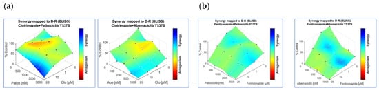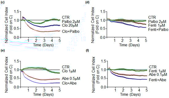 To circumvent this problem, CDK4/CDK6 inhibitors (i.e., palbociclib, ribociclib, and abemaciclib) are being introduced in the clinical practice as useful drugs to be combined with ET drugs [,]. Since Clo and Fenti display anti-proliferative activities in cells modeling MBC (i.e., Y537S cells), we next decided to evaluate the possibility that they could display synergistic effects with CDK4/CDK6 inhibitors. Initial experiments were performed in Y537S cells to find the palbociclib, ribociclib, and abemaciclib IC50 in Y537S cells. Growth curve analysis (data not shown) revealed that palbociclib (IC50 = 2.45 ± 0.35 µM) and abemaciclib (IC50 = 0.73 ± 0.12 µM) are more effective than ribociclib (IC50 = 18.29 ± 2.55 µM) in reducing Y537S cell proliferation. Therefore, we next treated Y537S cells with increasing concentrations of Clo, Fenti, palbocilib, and abemaciclib. Combination analyses of both Clo and Fenti with either palbociclib or abemaciclib displayed surfaces of synergy (Figure 8a,b) and significantly reduced the number of Y537S cells with respect to both untreated, Clo-, Fenti- and palbociclib- and abemaciclib-treated cells (Figure 8a–d). These data indicate that Clo and Fenti demonstrate synergism with CKD4/CDK6 inhibitors in preventing the proliferation of cell modeling MBC.
