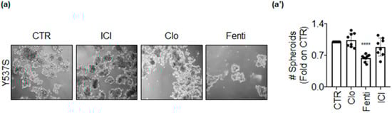 Next, we studied the anti-proliferative effects of Clo and Fenti in Y537S tumor cell spheroids, also using ICI as an internal control. Tumor spheroids were counted at time 0 (i.e., before drug administration), and at the end of the treatment (i.e., 7 days). Y537S cell spheroids grew within the experimental window (i.e., 7 days), and ICI and Clo were not able to prevent Y537S spheroid growth (Figure 9). On the contrary, Fenti reduced the number of Y537S spheroids (Figure 9). Therefore, Fenti but not Clo maintains its anti-proliferative activity also in a 3D environment.