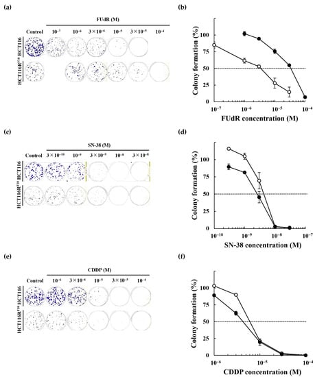 The anticancer drugs 5-FU, FUdR, CDDP, and SN-38 were obtained from FUJIFILM Wako Pure Chemical Corporation (Osaka, Japan). 5-FU, CDDP, and SN-38 were stored as 100 mM stocks in dimethyl sulfoxide (DMSO, Sigma-Aldrich; Merck KGaA, Darmstadt, Germany) at −20 °C. FUdR was stored as a 20 mM stock solution in ultrapure water at −20 °C.