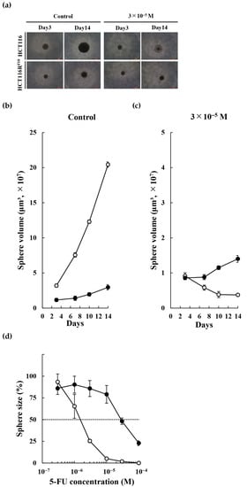 HCT116 and HCT116RF10 cells were seeded into 96-well PrimeSurface® plate 96U (Sumitomo Bakelite Co., Ltd., Tokyo, Japan) plates (1000 cells per well) in triplicate and then treated with various concentrations of 5-FU or DMSO (as a negative control). Following incubation for 14 days, tumor sphere size was monitored once every 3–4 days. Tumor sphere volume (V) was calculated using the following formula: V = ab2/2 (a and b are the long and short diameters of the tumor sphere, respectively).