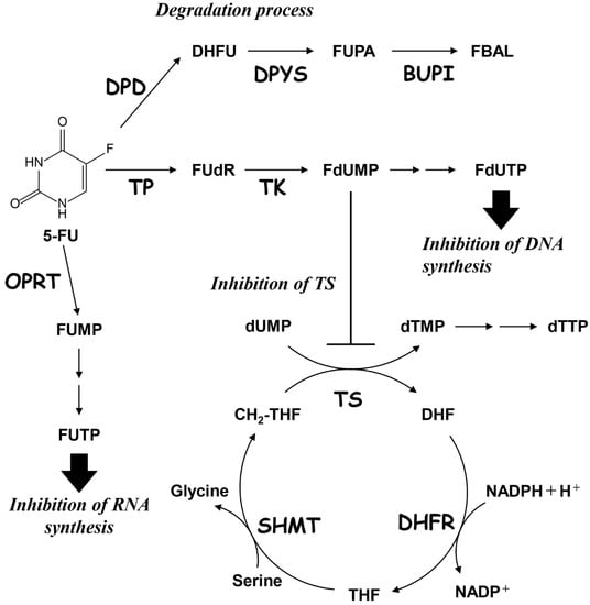 Metabolic pathways associated with 5-FU. 5-FU, 5-fluorouracil; DHFU, dihydrofluorouracil; FUPA, fluoroureidopropionate; FBAL, fluoroalanine; FUdR, fluorodeoxyuridine; FdUMP, fluorodeoxyuridine monophosphate; FdUTP, fluorodeoxyuridine triphosphate; FUMP, fluorouridine monophosphate; FUTP, fluorouridine triphosphate; dUMP, deoxyuridine monophosphate; dTMP, deoxythymidine monophosphate; dTTP, deoxythymidine triphosphate; CH2-THF, 5,10-methylenetetrahydrofolate; DHF, dihydrofolate; THF; tetrahydrofolate; TS, thymidylate synthase; DPD, dihydropyrimidine dehydrogenase; DPYS, dihydro pyrimidase; DHFR, dihydrofolate reductase; BUPI, β-ureido propionase; TP, thymidine phosphorylase; TK, thymidine kinase; SHMT, serine hydroxymethyltransferase; and OPRT, orotate phosphoribosyltransferase 1.