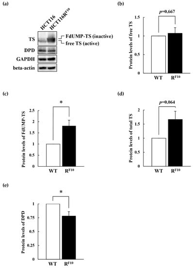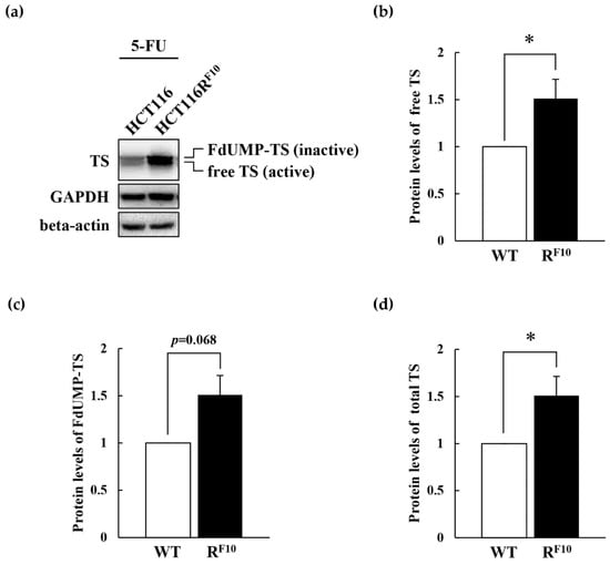 To elucidate the association of TS and DPD expression with 5-FU resistance, we analyzed TS and DPD expression levels in parental HCT116 and 5-FU-resistant HCT116RF10 cells by Western blot analysis (Figure 6a). Interestingly, as shown in Figure 6a (top panel) and 6b, free-TS protein levels were almost identical in HCT116RF10 and HCT116 cells. Conversely, the FdUMP–TS covalent complex was 1.8-fold higher in HCT116RF10 cells than in HCT116 cells (Figure 6a top panel and 6c). Importantly, it should be noted that total TS, the free form, the FdUMP-covalent form, and total TS was overexpressed in HCT116RF10 cells rather than in HCT116 cells (Figure 6a top panel and Figure 6d). The upper band of TS, indicated FdUMP-covalent form, which represents TS in ternary complexes and is correlated with the intracellular concentration of FdUMP [,,]. In addition, DPD protein levels were slightly decreased in HCT116RF10 cells than in parental HCT116 cells (Figure 6a second panel and Figure 6e). GAPDH and beta-actin were used as an internal controls (Figure 6a third and bottom panels). In parental HCT116 cells and HCT116RF10 cells, both internal control proteins, GAPDH and beta-actin, had similar levels. After treatment with 1 × 10−4 M 5-FU for 24 h, the protein levels of free TS, FdUMP–TS covalent complex, and total TS were individually about 1.5-fold higher in HCT116RF10 cells than in parental HCT116 cells (Figure 7a–d). Intriguingly, these data indicated that the proportion of active free TS in the intracellular total TS was highly regulated in the 5-FU resistant HCT116RF10 cells. These findings suggested that the regulation of TS status, which includes the balance of active free TS or the inactive FdUMP–TS covalent complex, may confer resistance to 5-FU.