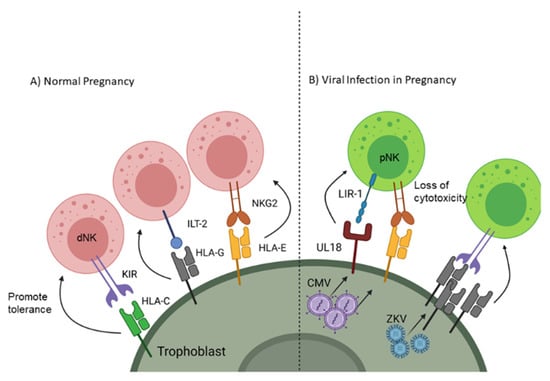 Receptor signaling on trophoblast cells to promote natural killer (NK) cell tolerance to the fetus and viruses. (A) Non-classical MHC interactions with NK cells promotes decidual (d)NK phenotype and tolerance. (B) Overexpression of non-classical MHC and upregulation of decoy receptors are used by viruses (CMV and Zika virus (ZKV)) to blunt peripheral (p)NK cytotoxicity. Created with BioRender.com. Accessed on 6 February 2021