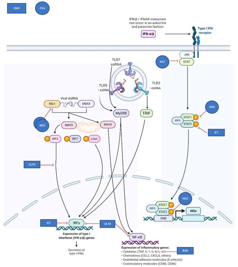 Further downstream, CMV IE86 inhibits production of the pro-inflammatory cytokine IL-1β []. Other CMV gene products involved in inhibition of the innate response include UL44, IE2, and UL94 [,,]. Both CMV and Zika virus, model congenital pathogens, target the host interferon response while causing robust infections during early gestation when innate immunity in the placenta is less effective.