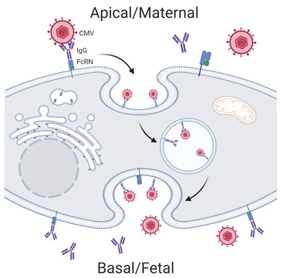 Viral pathogens have fewer known mechanisms of evading humoral immunity. Interestingly, the unique maternal-fetal IgG transport pathway of the trophoblast makes the placenta and fetus susceptible to some viral infections. Antibody-dependent enhancement (ADE) allows for low-affinity virus-specific IgG to facilitate transport of Zika virus across the cell membrane via FcR-mediated endocytosis. ADE is thought to be one mechanism by which Zika virus efficiently infects the placenta in women with previous Dengue virus infections (Figure 3) []. Both HIV and CMV have also been shown to use ADE to traverse the trophoblast during early infection when low-avidity IgG antibodies predominate [,,].