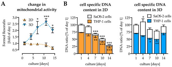 Osteogenic differentiation of SaOS-2 cells was usually exhausted after 10–14 days in culture, when viability significantly dropped and matrix mineralization reached a maximum []. Osteoclastic differentiation of THP-1 cells reached its limits already after 7 days in culture []. However, when differentiating SaOS-2 cells and THP-1 cells in direct 2D coculture, cells remained viable and functional for at least 14 days. The direct 2D coculture of SaOS-2 cells and THP-1 cells showed constant mitochondrial activity over the 14 days of culture. In contrast, mitochondrial activity increased, when cells were differentiated in 3D coculture (Figure 1A). As mitochondrial activity cannot differentiate between the two cell types in the coculture, cell-specific DNA content was determined. In 2D coculture DNA from both SaOS-2 cells and THP-1 cells significantly decreased, starting at day 7 of culture. In 3D coculture, the decrease in THP-1 cells’ DNA was less pronounced than in 2D coculture, and seemed to recover until day 14. SaOS-2 cells’ DNA remained stable over the entire differentiation period in 3D coculture (Figure 1B).