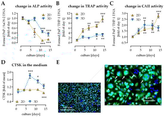 Comparison of functionality of THP-1 cells and SaOS-2 cells in 2D and 3D coculture. THP-1 cells and SaOS-2 cells (2:1 ratio) were cocultured over 14 days in 2D and 3D on pHEMA-based cryogel scaffolds. On days 1, 4, 7, 10, and 14 of culture, (A) alkaline phosphatase (ALP) activity, (B) tartrate-resistant acidic phosphatase (TRAP) activity, (C) carbonic anhydrase II (CAII) activity, and (D) cathepsin K (CTSK) levels were measured. (E) On day 7 life-dead-staining revealed the presence of large multinucleated cells (arrow). Data are presented as curves (mean ± SEM). Changes over time were compared by nonparametric Friedmann test, followed by Dunn’s multiple comparison test. * p < 0.05, ** p < 0.01, and *** p < 0.0001 as compared to the respective day 1. N ≥ 3 and n = 3.