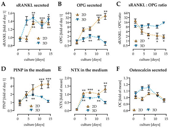 Secreted markers for osteoblast and osteoclast function in 2D and 3D cocultures of THP-1 cells and SaOS-2 cells. THP-1 cells and SaOS-2 cells (2:1 ratio) were cocultured over 14 days in both 2D and 3D on pHEMA-based cryogel scaffolds. On days 1, 4, 7, 10, and 14 of culture, (A) soluble receptor activator of nuclear factor kappa-Β ligand (sRANKL), (B) osteoprotegerin (OPG), and (C) the sRANKL:OPG ratio, (D) procollagen type I N-terminal propeptide (PINP), (E) collagen-type I N-telopeptide (NTX), and (F) osteocalcin levels were detected in the culture supernatant. Data are presented as curves (mean ± SEM). Changes over time were compared by nonparametric Friedmann test, followed by Dunn’s multiple comparison test. * p < 0.05, ** p < 0.01, and *** p < 0.0001 as compared to day 1. N = 3, n = 2.