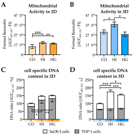 2D and 3D cocultures were differentiated in the presence or absence of high insulin levels and high glucose levels to simulate the development of a type 2 diabetes []. In 2D coculture, mitochondrial activity was increased by both high insulin (HI) and high glucose (HG). In 3D coculture, however, mitochondrial activity was increased only by high insulin (Figure 4A,B). In 2D coculture, this effect came along with an increased amount of THP-1 cells, while in 3D coculture pre-/diabetic conditions increased the amount of SaOS-2 cells (Figure 4C,D).