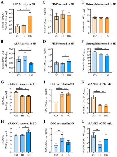 Influence of pre-/diabetic conditions on SaOS-2 cells’ function in 2D and 3D cocultures. THP-1 cells and SaOS-2 cells (2:1 ratio) were differentiated for 14 days as (A,C,E,G,I,K) 2D and (B,D,F,H,J,L) 3D cocultures in the presence or absence of high insulin levels (HI = prediabetic conditions) or high glucose levels (HG = diabetic conditions). On days 1, 4, 7, 10, and 14 of culture, (A,B) alkaline phosphatase (ALP) activity was measured. At the same time points (C,D) procollagen type I N-terminal propeptide (PINP), (E,F) osteocalcin, (G,H) soluble receptor activator of nuclear factor kappa-Β ligand (sRANKL), (I,J) osteoprotegerin (OPG) levels, and (K,L) the sRANKL:OPG ratio were detected in the culture supernatants. ALP activity was determined on the day of culture before it dropped significantly. For the other factors the entire differentiation period was considered, and data are presented as area under the curve (AUC/mean ± SEM). Data were compared by nonparametric Friedmann test, followed by Dunn’s multiple comparison test. * p < 0.05 and ** p < 0.01 as indicated. N = 3, n = 3.