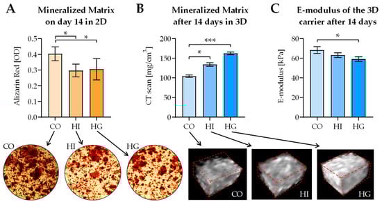 Influence of pre-/diabetic conditions on the formation of mineralized matrix and matrix stiffness in 2D and 3D cocultures of THP-1 cells and SaOS-2 cells. THP-1 cells and SaOS-2 cells (2:1 ratio) were differentiated for 14 days as (A) 2D and (B,C) 3D coculture, in the presence or absence of high insulin levels (HI = prediabetic conditions) or high glucose levels (HG = diabetic conditions). After 14 days of culture matrix mineralization was quantified by (A) Alizarin Red staining in 2D with representative microscopic image and (B) quantitative computer tomography (CT) scans in 3D, with a representative 3D reconstruction of the central core of the scaffold. (C) In 3D cocultures matrix stiffness (E-modulus) was also determined using a ZwickiLine Z 2.5TN material testing machine. Data, represented as mean ± SEM, were compared by nonparametric Friedmann test, followed by Dunn’s multiple comparison test. * p < 0.05 and *** p < 0.0001 as indicated. N = 3, n = 3.
