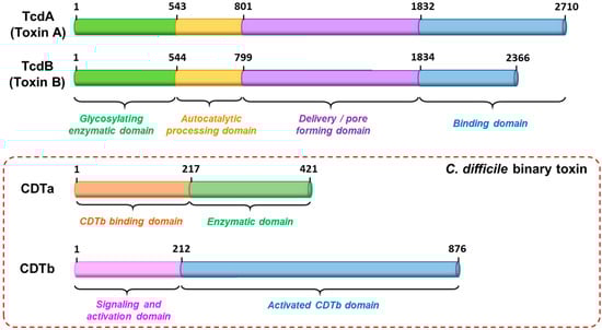 - Aktories, K.; Schwan, C.; Jank, T. Clostridium difficile Toxin Biology. Annu. Rev. Microbiol. 2017, 71, 281–307. [Google Scholar] [CrossRef]