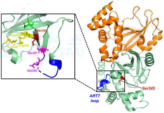 The ARTT loop is found in most ADP-ribosylating toxins, including CDT, cholera toxin, diphtheria toxin, and E. coli enterotoxin []. Although the length of the loop varies, it contains residues that are important both for substrate binding and for the enzyme’s ADP-ribosylation activity. The ARTT loop in CDTa (Figure 2) includes residues 377–387, and fast timescale dynamics observed by NMR for several residues in this loop, shows that they are highly flexible, a feature that is likely important for substrate binding to CDTa as well as for its catalytic activity []. Such a conclusion is supported by studies showing that NAD+ or NADPH binding to CDTa stabilized the disordered character of the ARTT loop (unpublished observation). Other conditions, including pH, were also found to change the structural characterization of this loop. For example, at basic pH values between 8.5 and 9.0, a stable loop structure was observed while lowering the pH to 4.0 caused residues within the ARTT loop to be unobservable via X-ray crystallography and were likely dynamic in nature []. Likewise, the NAD+/NADPH substrates were found to form hydrogen bonds with Arg302, Arg303, Arg359, Gln307, Asn342, and Ser345, at basic pH values, also implicating the importance of these residues in the enzyme’s active site (Figure 2, inset) []. The importance of specific residues for ADP-ribosylation activity was examined further using site-directed mutagenesis []. Specifically, the S345A mutation was found to block cellular toxicity as monitored using Vero cell death while the S435Q, S345F, and S345R mutations abolished any detectable activity (>1000-fold) []. Because these mutations at S345 did not affect substrate binding directly, it was concluded that S345 was important for the enzyme’s catalytic ribosyl transferase activity.